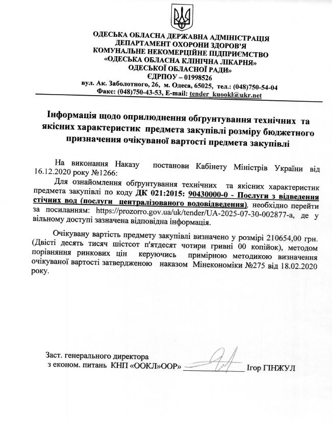 Інформація щодо оприлюднення обґрунтування технічних  та якісних характеристик  предмета закупівлі розміру бюджетного призначення очікуваної вартості предмета закупівлі по коду ДК 021:2015: 90430000-0 – Послуги з відведення стічних вод (послуги  централізованого водовідведення)