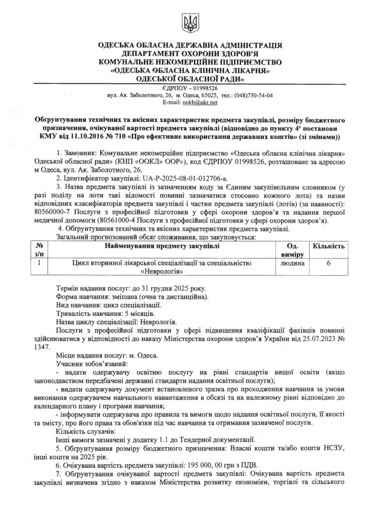 Інформація щодо оприлюднення обґрунтування технічних  та якісних характеристик  предмета закупівлі розміру бюджетного призначення очікуваної вартості предмета закупівлі по коду ДК 021:2015: 80560000-7 Послуги з професійної підготовки у сфері охорони здоров’я та надання першої медичної допомоги (80561000-4 Послуги з професійної підготовки у сфері охорони здоров’я)