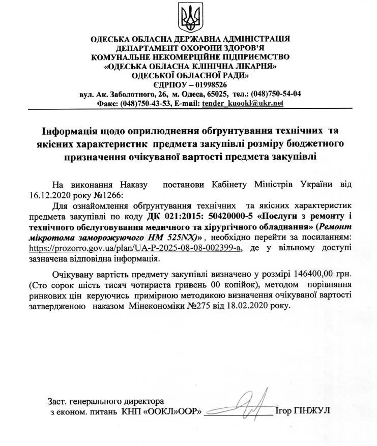 Інформація щодо оприлюднення обґрунтування технічних та якісних характеристик предмета закупівлі розміру бюджетного призначення очікуваної вартості предмета закупівлі по коду ДК 021:2015: 50420000-5 «Послуги з ремонту і технічного обслуговування медичного та хірургічного обладнання» (Ремонт мікротома заморожуючого HM 525NX)»