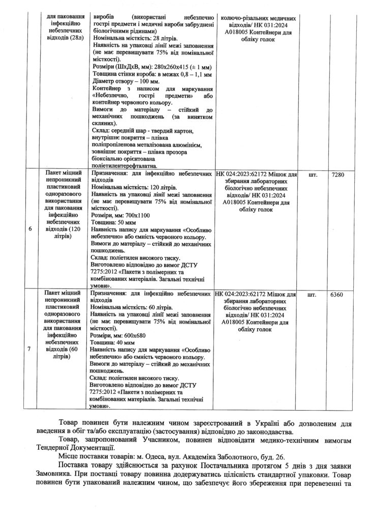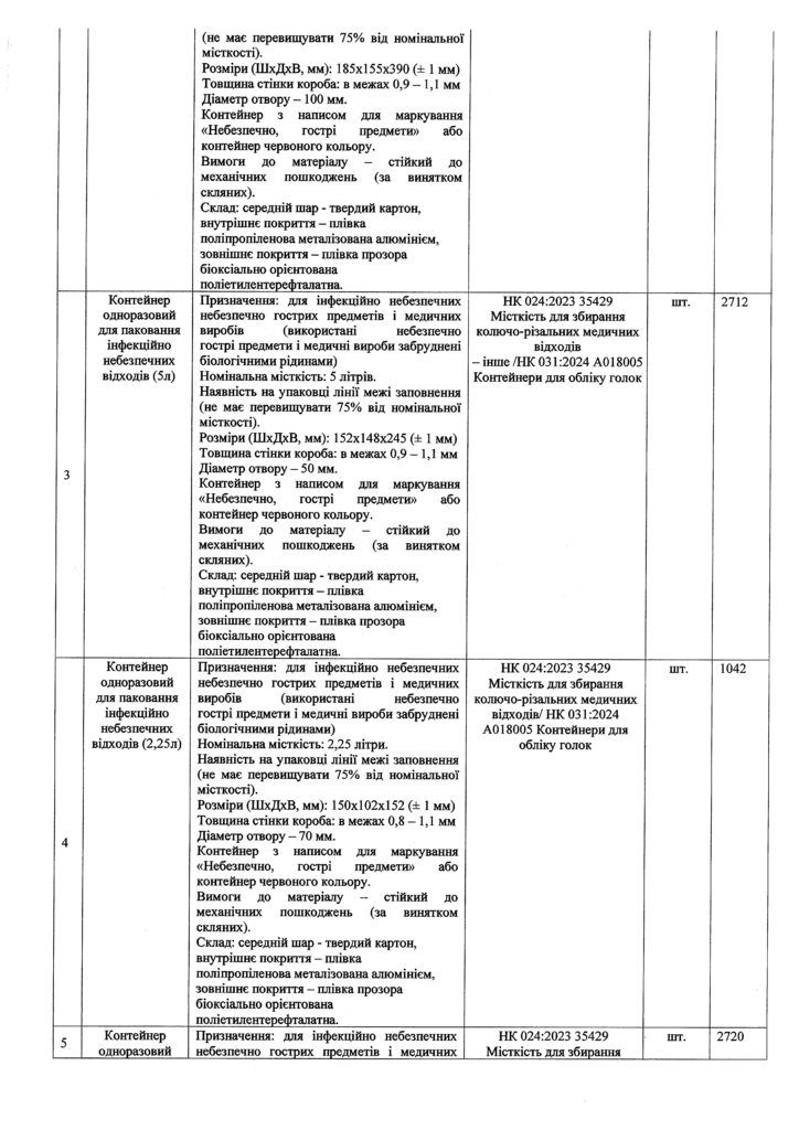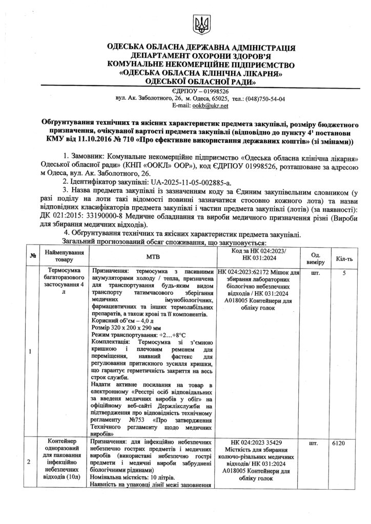 > закупівлі > Інформація щодо оприлюднення обґрунтування технічних та якісних характеристик предмета закупівлі розміру бюджетного призначення очікуваної вартості предмета закупівлі по коду ДК 021:2015: 33190000-8 Медичне обладнання та вироби медичного призначення різні (Вироби для збирання медичних відходів)