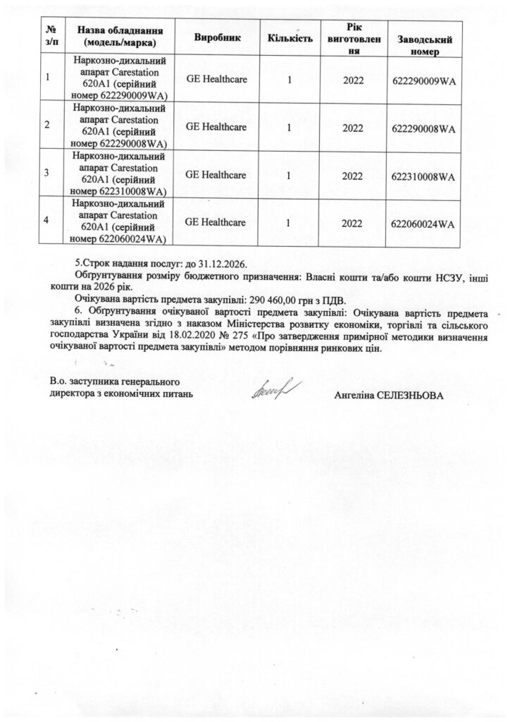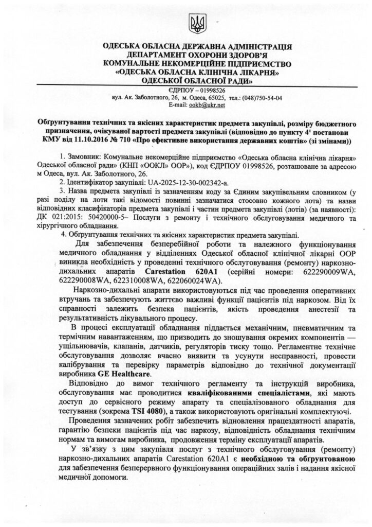Інформація щодо оприлюднення обґрунтування технічних  та якісних характеристик  предмета закупівлі розміру бюджетного призначення очікуваної вартості предмета закупівлі по коду ДК 021:2015: 50420000-5– Послуги з ремонту і технічного обслуговування медичного та хірургічного обладнання (50421000-2 Послуги з ремонту і технічного обслуговування медичного обладнання)