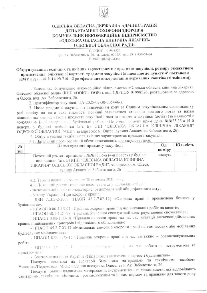 Інформація щодо оприлюднення обґрунтування технічних та якісних характеристик предмета закупівлі розміру бюджетного призначення очікуваної вартості предмета закупівлі по коду ДК 021:2015: 45450000-6 Інші завершальні будівельні роботи (Капітальний ремонт санвузлів та палат відділення реабілітації п’ятого поверху головного корпусу (літ. А) КНП «Одеська обласна клінічна лікарня» ООР» за адресою: м. Одеса, вул. Академіка Заболотного, 26)