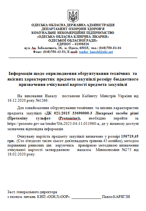 > закупівлі > Інформація щодо оприлюднення обґрунтування технічних та якісних характеристик предмета закупівлі розміру бюджетного призначення очікуваної вартості предмета закупівлі ДК 021:2015 33690000-3 Лікарські засоби різні (Протаміну сульфат (Protamine))