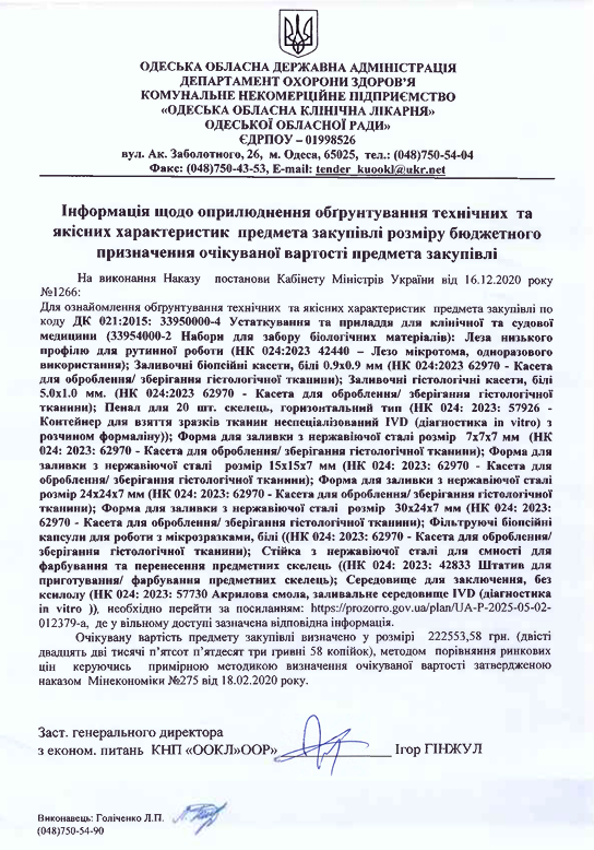Інформація щодо оприлюднення обґрунтування технічних та якісних характеристик предмета закупівлі розміру бюджетного призначення очікуваної вартості предмета закупівлі по коду ДК 021:2015: 33950000-4 Устаткування та приладдя для клінічної та судової медицини (33954000-2 Набори для забору біологічних матеріалів): Леза низького профілю для рутинної роботи (НК 024:2023 42440 – Лезо мікротома, одноразового використання); Заливочні біопсійні касети, білі 0.9×0.9 мм (НК 024:2023 62970 – Касета для оброблення/ зберігання гістологічної тканини); Заливочні гістологічні касети, білі 5.0×1.0 мм. (НК 024:2023 62970 – Касета для оброблення/ зберігання гістологічної тканини); Пенал для 20 шт. скелець, горизонтальний тип (НК 024: 2023: 57926 – Контейнер для взяття зразків тканин неспеціалізований IVD (діагностика in vitro) з розчином формаліну)); Форма для заливки з нержавіючої сталі розмір 7х7х7 мм (НК 024: 2023: 62970 – Касета для оброблення/ зберігання гістологічної тканини); Форма для заливки з нержавіючої сталі розмір 15х15х7 мм (НК 024: 2023: 62970 – Касета для оброблення/ зберігання гістологічної тканини); Форма для заливки з нержавіючої сталі розмір 24х24х7 мм (НК 024: 2023: 62970 – Касета для оброблення/ зберігання гістологічної тканини); Форма для заливки з нержавіючої сталі розмір 30х24х7 мм (НК 024: 2023: 62970 – Касета для оброблення/ зберігання гістологічної тканини); Фільтруючі біопсійні капсули для роботи з мікрозразками, білі ((НК 024: 2023: 62970 – Касета для оброблення/ зберігання гістологічної тканини); Стійка з нержавіючої сталі для ємності для фарбування та перенесення предметних скелець ((НК 024: 2023: 42833 Штатив для приготування/ фарбування предметних скелець); Середовище для заключення, без ксилолу (НК 024: 2023: 57730 Акрилова смола, заливальне середовище IVD (діагностика in vitro ))