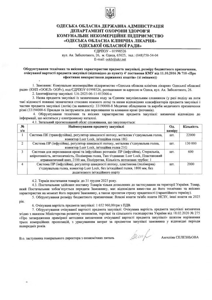 > закупівлі > Інформація щодо оприлюднення обґрунтування технічних та якісних характеристик предмета закупівлі розміру бюджетного призначення очікуваної вартості предмета закупівлі ДК 021:2015:33190000-8 Медичне обладнання та вироби медичного призначення різні (33194000-6 Прилади та інструменти для переливання та вливання крові /розчинів)